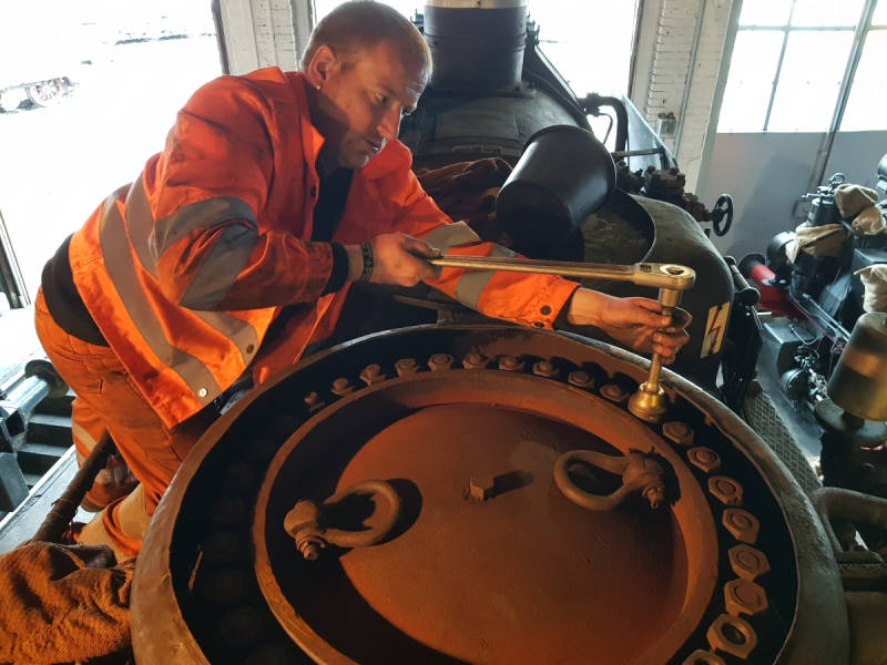 On top of the boiler is the steam dome, where the steam regulator is located. This is a large valve that the driver can open from the cab to release steam from the boiler into the drive cylinders. This regulator was removed for refurbishment. In order to be able to carry out the pressure test necessary for the boiler inspection, the opening and the steam dome itself were closed.