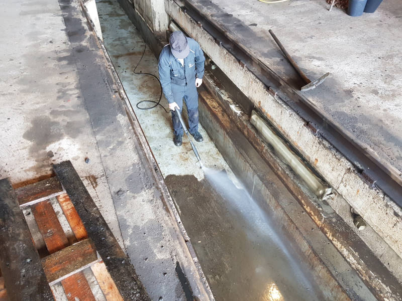 Water ran through the nozzle of our high-pressure cleaner. A hard-working colleague cleared the examination pit of dirt where Emma usually stands.