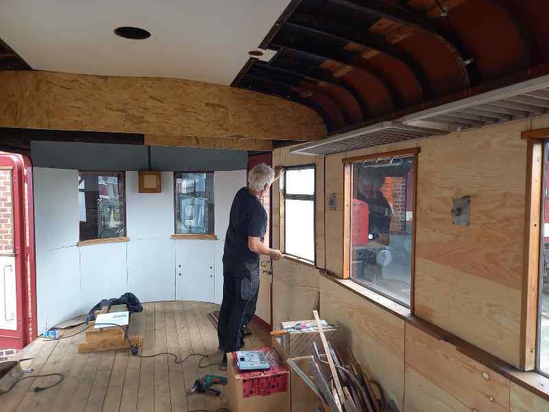 Work in the sidecar 197 805 was much quieter, but still busy. Here, the interior work on the walls continued.