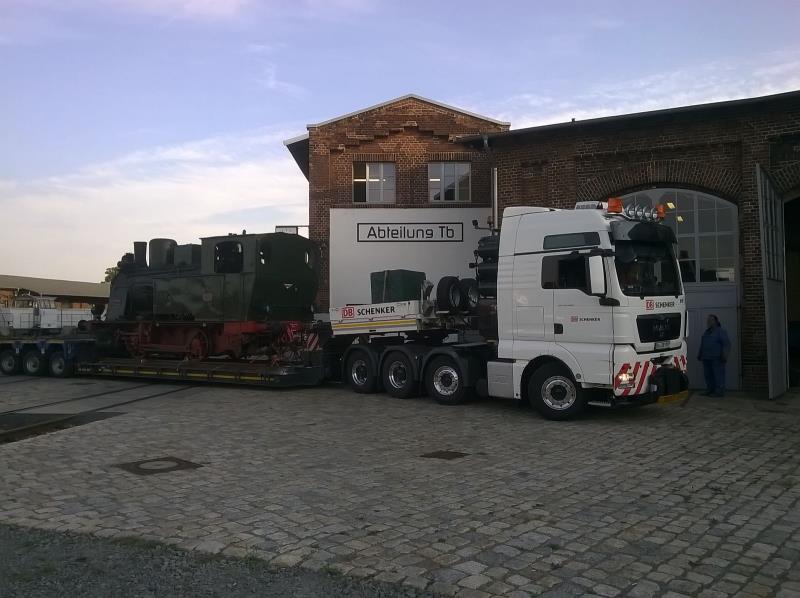 Unsere kleine Dampflok Emma soll wieder der heimliche Star der weltgrößten Messe für Eisenbahntechnik in Berlin werden. Diese Messe beginnt am 20.9. und endet am Sonntag darauf. Während dieser Zeit steht Emma für Führerstandsmitfahrten zur Verfügung. Da die kleine Lok nicht selbst den Weg nach Berlin auf eigener Achse zurücklegen kann, hat die Firma DB Schenker sie auf einen Schwertransporter verladen und zur Messe transportiert.