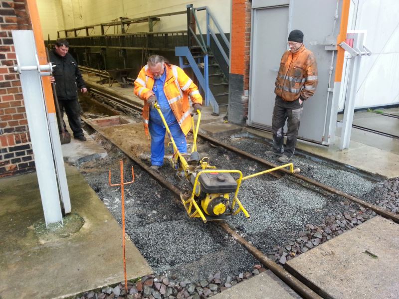 Old rails also had to be removed up to the shed door, to allow the foundations to be cleaned up. The following pictures show the unscrewing of the track-fixing bolts using a motorised rail bolt spanner and cutting a rail.