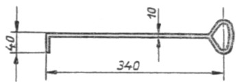| 1 Hammer 1 Meißel 1 Durchschlag 1 Splintzieher 10 Radkeile, die am Radumfang gleichmäßig anliegen 1 Lunte 4 Keile für Zylinderventile, aus Rundeisen mit kurzem Schenkel, als einseitige Keile ausgeschmiedet (s. Skizze) 1 Einsteckrohr für Voreilhebel |  Maße der Lok BR anpassen | |