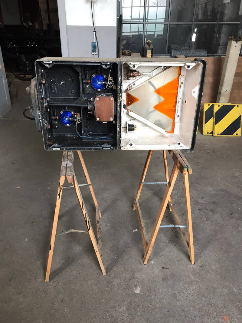 In the meantime, our electricians have also taken care of the new shunting signal, which will soon be put into operation in our track field. Before that, however, the cables, the lamps and the control system have to be checked. In addition, the "W" has to be given a transparent orange colour again. By the way, the W means "wait". Only when it lights up, a shunting train is allowed to pass the signal. The signal will be operated by our signal box Wm.